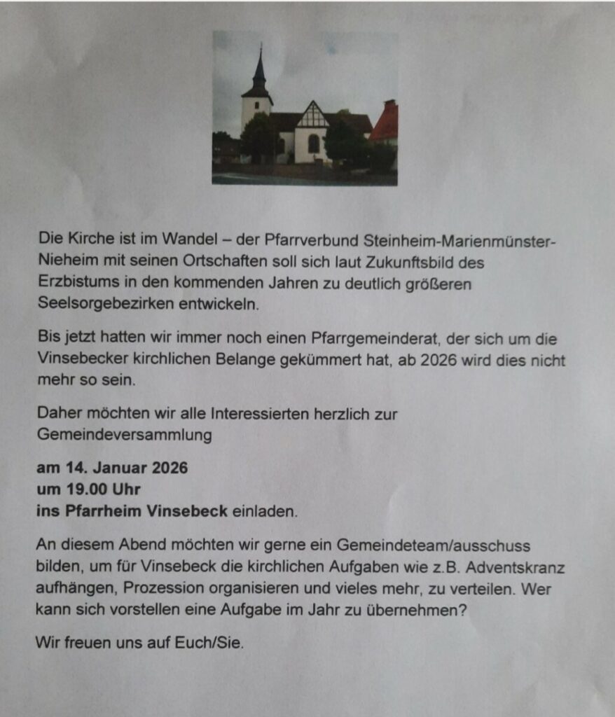 Gemeindeversammlung in Kultur, Religion Datum 14. Januar 2026 Zeit 19:00 Pfarrheim Vinsebeck Hauptstraße 15, 32839 Steinheim